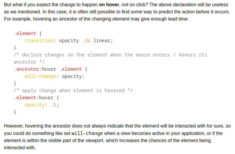 In order to avoid this delay, you can inform the browser about the changes some time before they actually happen. That way, it will have some time to prepare for these changes, so that when these changes occur, the element’s layer will be ready and the transform animation can be performed and then the element can be rendered and the page updated in quickly.