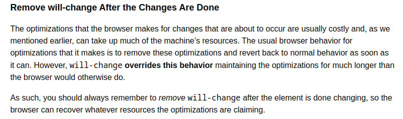 The will-change property allows you to inform the browser ahead of time of what kinds of changes you are likely to make to an element, so that it can set up the appropriate optimizations before they’re needed, therefore avoiding a non-trivial start-up cost which can have a negative effect on the responsiveness of a page. The elements can be changed and rendered faster, and the page will be able to update snappily, resulting in a smoother experience.