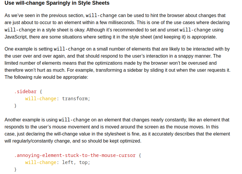 You can also declare to the browser your intention to change an element’s scroll position (the element’s position in the visible scroll window and how much of it is visible within that window), its contents, or one or more of its CSS property values by specifying the name of the properties you’re expecting to change. If you expect or plan to change multiple values/aspects of an element, you can provide a list of comma-separated values. For example, if you’re expecting the element to be animated and moved (its position changed), you can declare that to the browser like so: